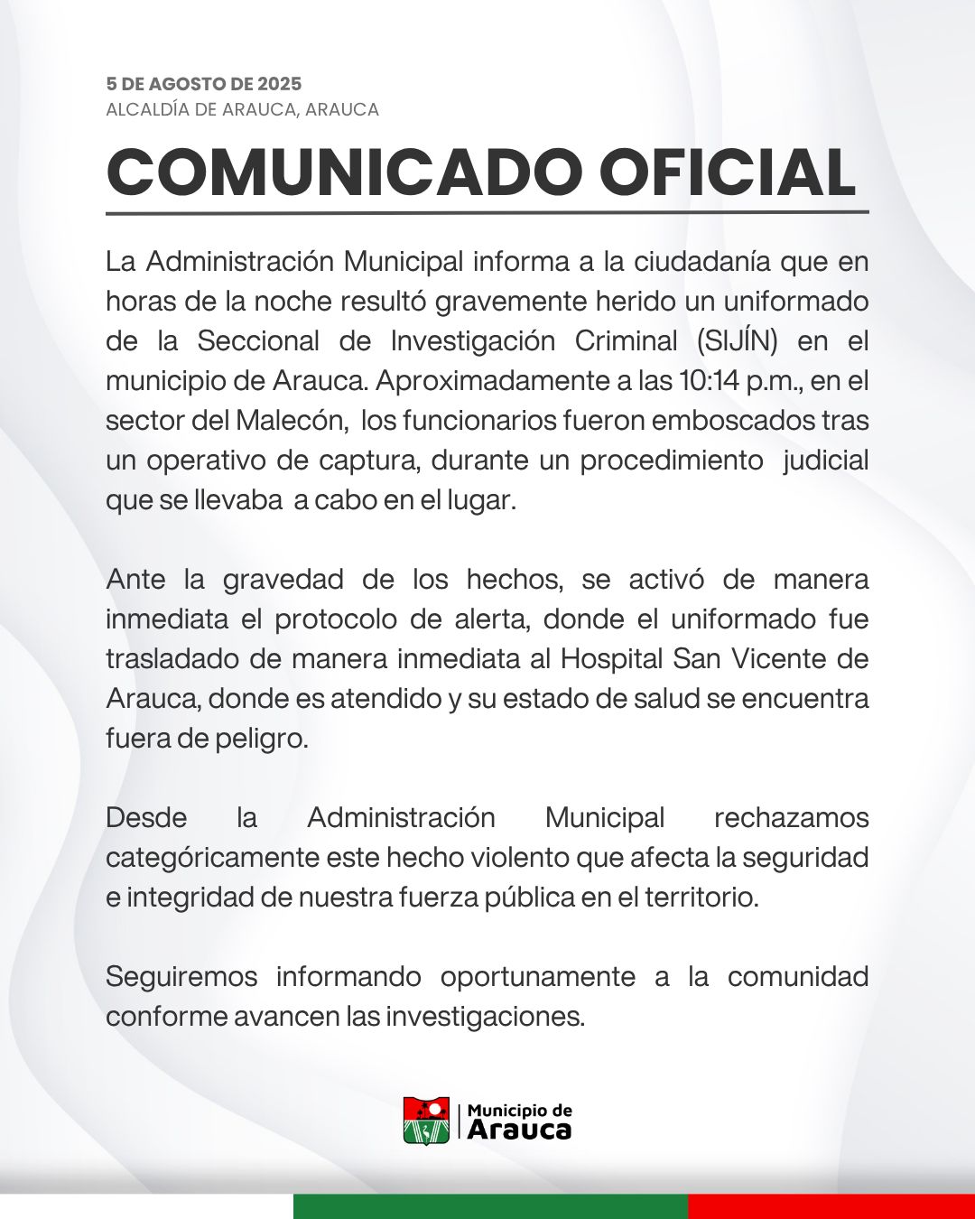 Fue el propio alcalde informó en sus redes sociales sobre el estado de salud del uniformado: “Estabilizado nuestro policía que resultó herido en el operativo en el sector del Malecón, gracias al buen trabajo de nuestros médicos del Hospital San Vicente de Arauca y la rápida reacción de sus compañeros para trasladarlo”. informó al mandatario local.