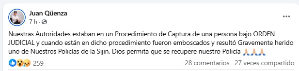 El alcalde de Arauca, Juan Alfredo Qüenza Ramos, confirmó el ataque a través de sus redes sociales y describió así lo ocurrido: “Nuestras autoridades estaban en un procedimiento de captura bajo orden judicial, y cuando estaban en dicho procedimiento fueron emboscados. Resultó gravemente herido uno de nuestros policías de la SIJIN. Dios permita que se recupere nuestro policía”.