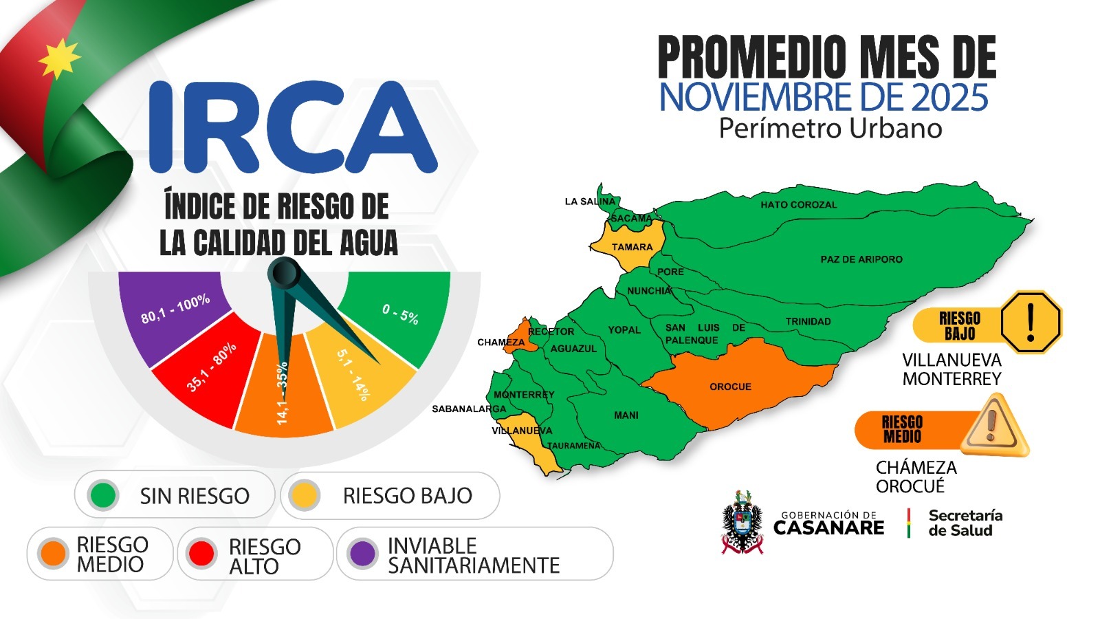 En cumplimiento de la normatividad vigente, la Secretaría de Salud presentó los resultados del Índice de Riesgo de la Calidad del Agua (IRCA) correspondientes a las áreas urbanas del departamento durante el mes de noviembre de 2025. El informe detalla el comportamiento de las condiciones físicas, químicas y microbiológicas del agua suministrada a la población.