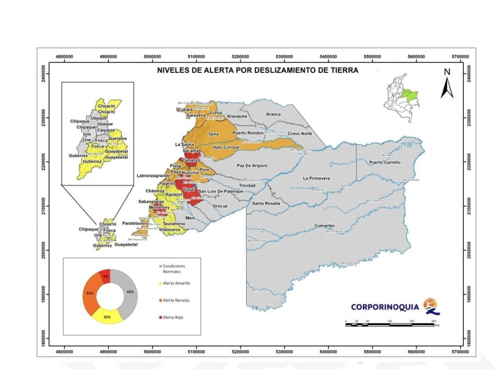 Los municipios de Monterrey, Yopal, Hato Corozal, Nunchía, Sabanalarga, Aguazul, Chámeza, Recetor, Tauramena, Villanueva, Támara, Pore y Sácama, presentan alto riesgo de deslizamientos, especialmente en zonas de ladera inestables.