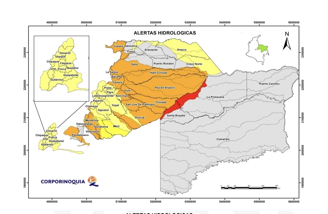 El más reciente reporte que emitió el IDEAM refleja probabilidad de crecientes súbitas en múltiples ríos y caños de la jurisdicción de Corporinoquia, lo que ya ha generado inundaciones en zonas rurales y urbanas. Hasta el momento, las zonas más críticas identificadas son: