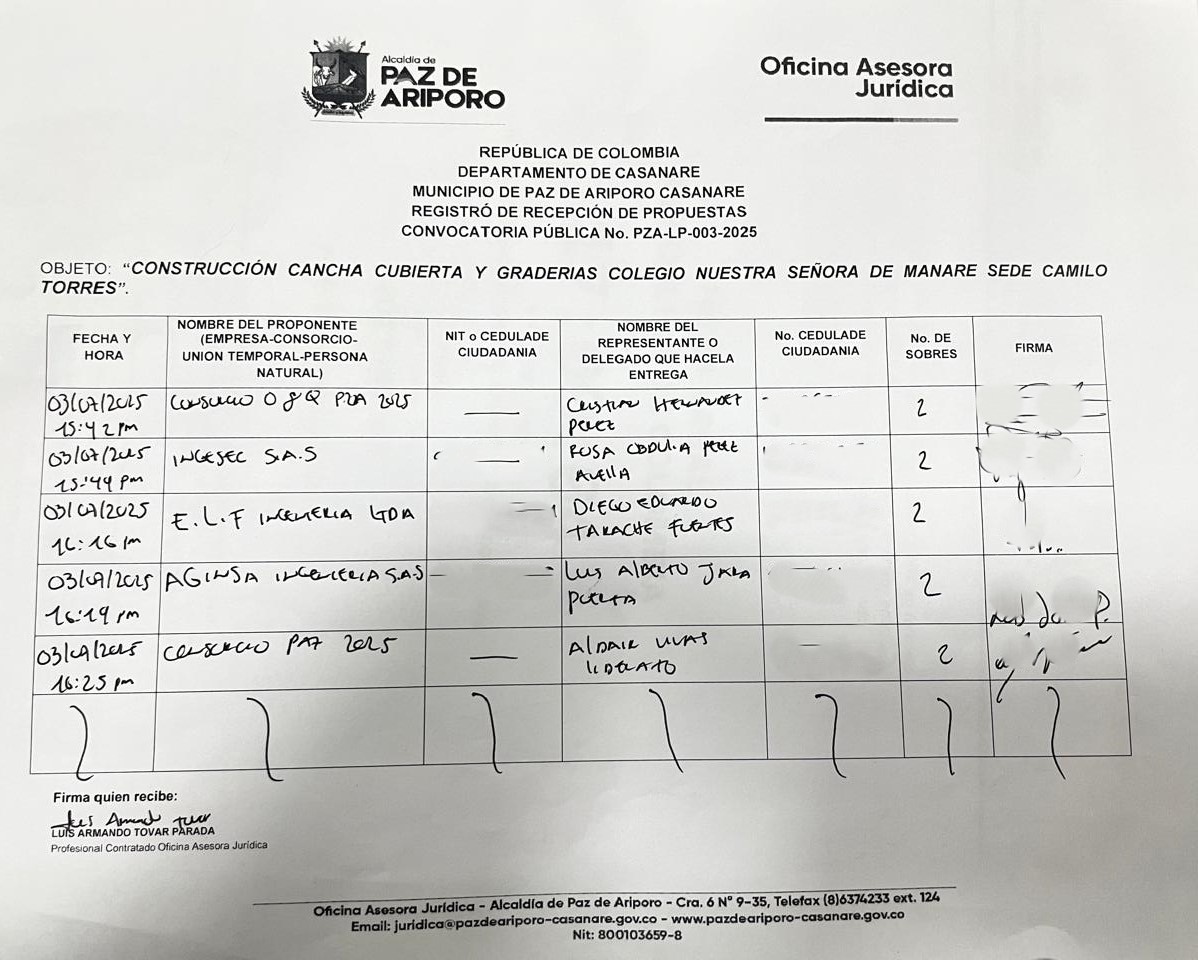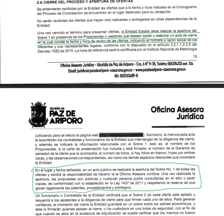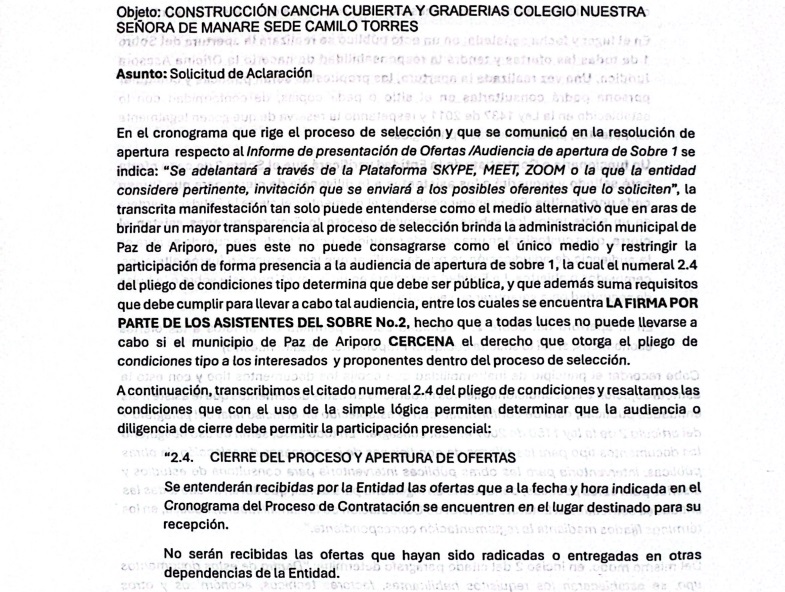 Por esta razón, uno de los proponentes ha solicitado claridad a la administración municipal a través de una carta donde menciona cada detalle de lo que haría de este acto público, una arbitrariedad. “En el cronograma que rige el proceso de selección y que se comunicó en la resolución de apertura respecto al /Informe de presentación de Ofertas /Audiencia de apertura de Sobre 1 se indica: “Se adelantará a través de la Plataforma SKYPE, MEET, ZOOM o la que la entidad considere pertinente, invitación que se enviará a los posibles oferentes que lo soliciten”, la transcrita manifestación tan solo puede entenderse como el medio alternativo que en aras de brindar un mayor transparencia al proceso de selección brinda la administración municipal de Paz de Ariporo, pues este no puede consagrarse como el único medio y restringir la participación de forma presencia a la audiencia de apertura de sobre 1, la cual el numeral 2.4 del pliego de condiciones tipo determina que debe ser pública, y que además suma requisitos que debe cumplir para llevar a cabo tal audiencia, entre los cuales se encuentra LA FIRMA POR PARTE DE LOS ASISTENTES DEL SOBRE No.2, hecho que a todas luces no puede llevarse a cabo si el municipio de Paz de Ariporo CERCENA el derecho que otorga el pliego de condiciones tipo a los interesados y proponentes dentro del proceso de selección”. Indica la misiva.