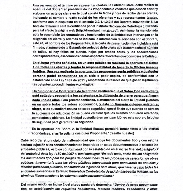 Es bien sabido que cualquier persona o empresa puede participar en dichos procesos y los demás proponentes manifiestan no tener nada en contra del contratista, pero ven con desconfianza las acciones de esta administración desconociendo lo consignado en el pliego de condiciones definitivo. Que indica: “Una vez vencido el término para presentar ofertas, la Entidad Estatal debe realizar la apertura del Sobre 1 en presencia de los Proponentes o veedores que deseen asistir y elaborar un acta de cierre en la cual conste la fecha y hora de recibo de las ofertas, indicando el nombre o razón social de los oferentes y sus representantes legales, conforme con lo dispuesto en el artículo 2.2.1.1.2.2.5 del Decreto 1082 de 2015. La hora de referencia será la certificada por el Instituto Nacional de Metrología (utilizando para tal efecto la página web [http://horalegal.inm.gov.co]). Asimismo, la mencionada acta la suscribirán los contratistas y funcionarios de la Entidad que intervengan en la diligencia del cierre, y además se indicará la información relacionada con el Sobre 1, esto es, el nombre de los Proponentes, si la carta de presentación fue incluida y está firmada; el número de la Garantía de seriedad de la oferta que la acompaña; el número de folios, si hay folios en blanco, hojas por ambas caras, y las observaciones correspondientes, así como los demás aspectos relevantes que considere la Entidad”. Esto indica que el acto público debe realizarse de manera presencial y en el proceso se advierte que esta audiencia se realizará virtual, lo que estaría cercenando la posibilidad a los proponentes de firmar los sobres como está normado para garantizar la transparencia del proceso.