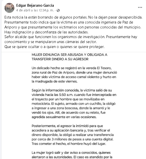 ¿Por qué en los dos casos de violación a mujeres del municipio de Paz de Ariporo no ha habido pronunciamiento contundente del alcalde ante la gravedad de los hechos con la misma inmediatez y rigurosidad que ataca a los medios que intentan informar lo que ocurre en materia de seguridad en el municipio?