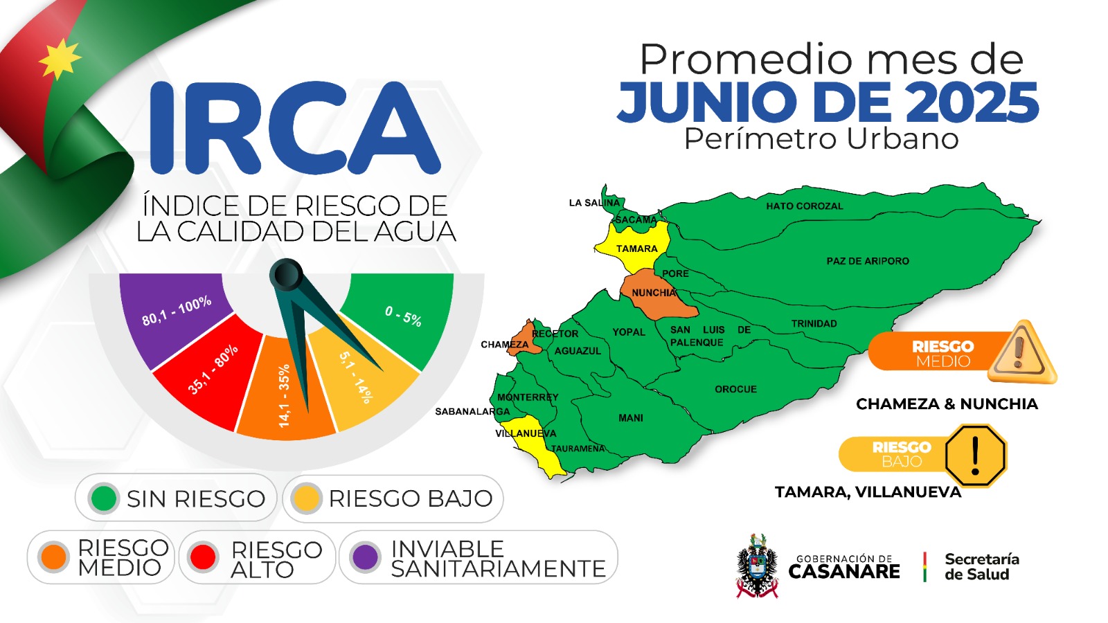 La Secretaría de Salud de Casanare informó a la opinión pública los resultados del monitoreo del Índice de Riesgo de la Calidad del Agua (IRCA) correspondiente al mes de junio de 2025, realizado conforme a lo establecido en la Resolución 2115 de 2007.