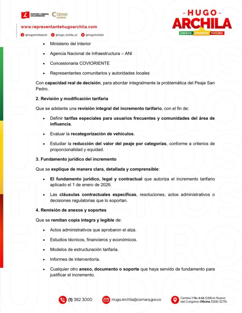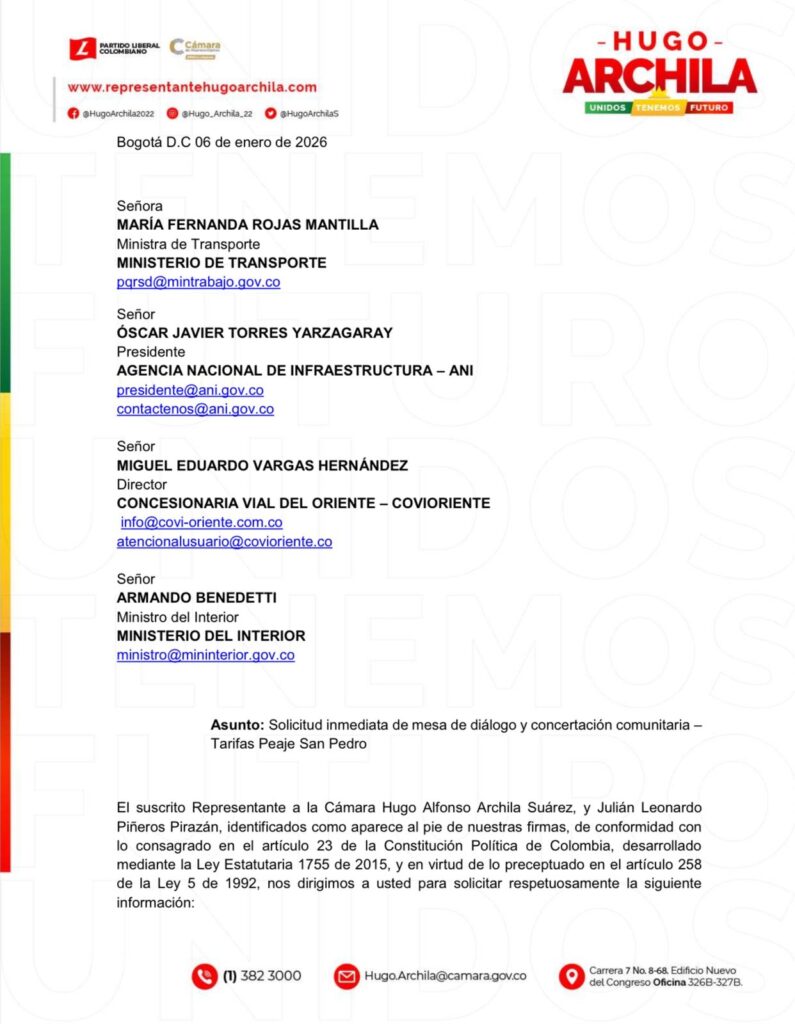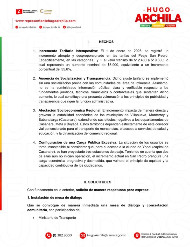 El representante a la Cámara por Casanare, Hugo Archila Suárez, junto con el líder Julián Leonardo Piñeros Pirazán de Villanueva, radicaron una solicitud formal ante el Gobierno Nacional para que se convoque de manera inmediata una mesa de diálogo y concertación comunitaria que permita revisar el intempestivo incremento tarifario aplicado en el Peaje San Pedro desde el 1 de enero de 2026.
