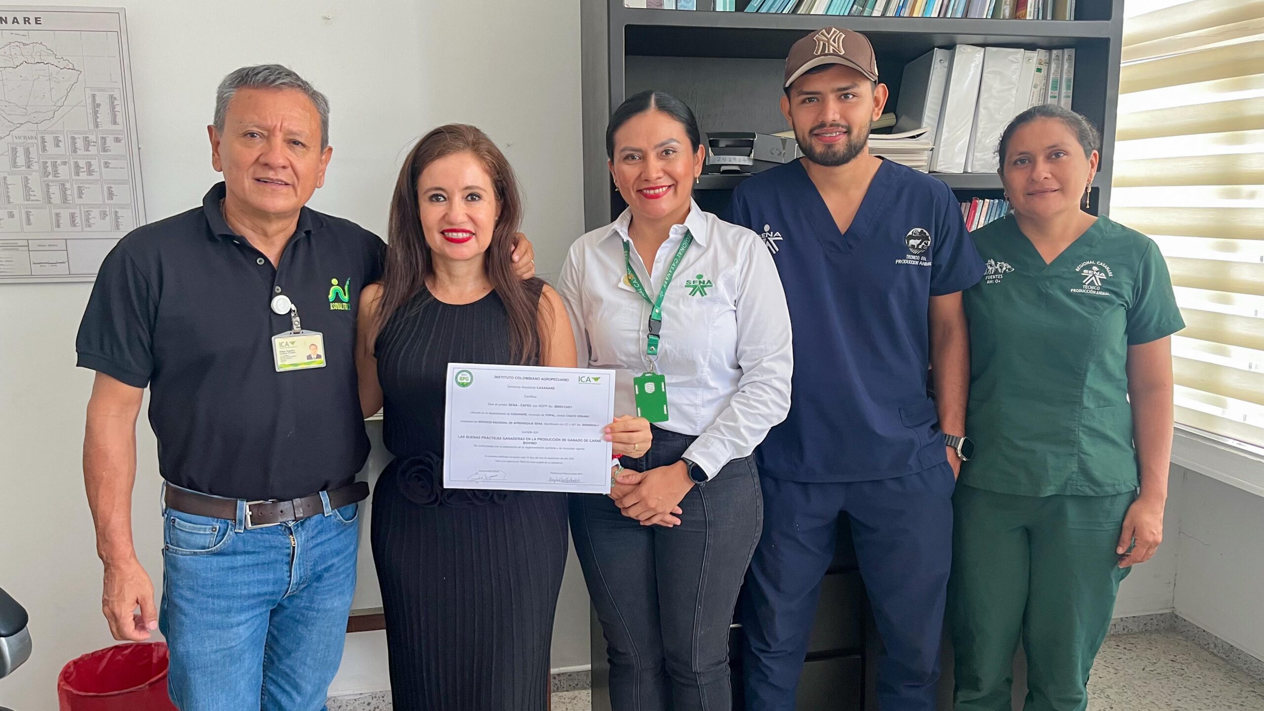La directora del SENA Casanare, Johana Medina Peña, recibió la certificación junto a los aprendices del Técnico en Producción Animal y la instructora María del Pilar Rodríguez, resaltando que este logro refleja la calidad de la formación impartida: