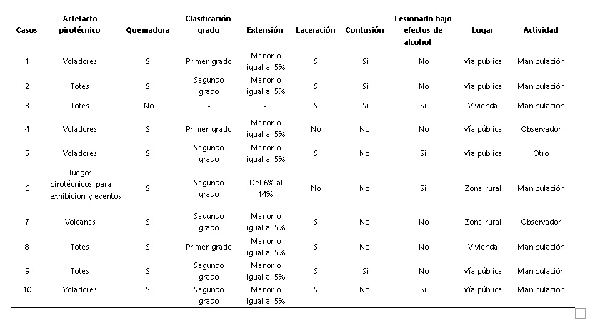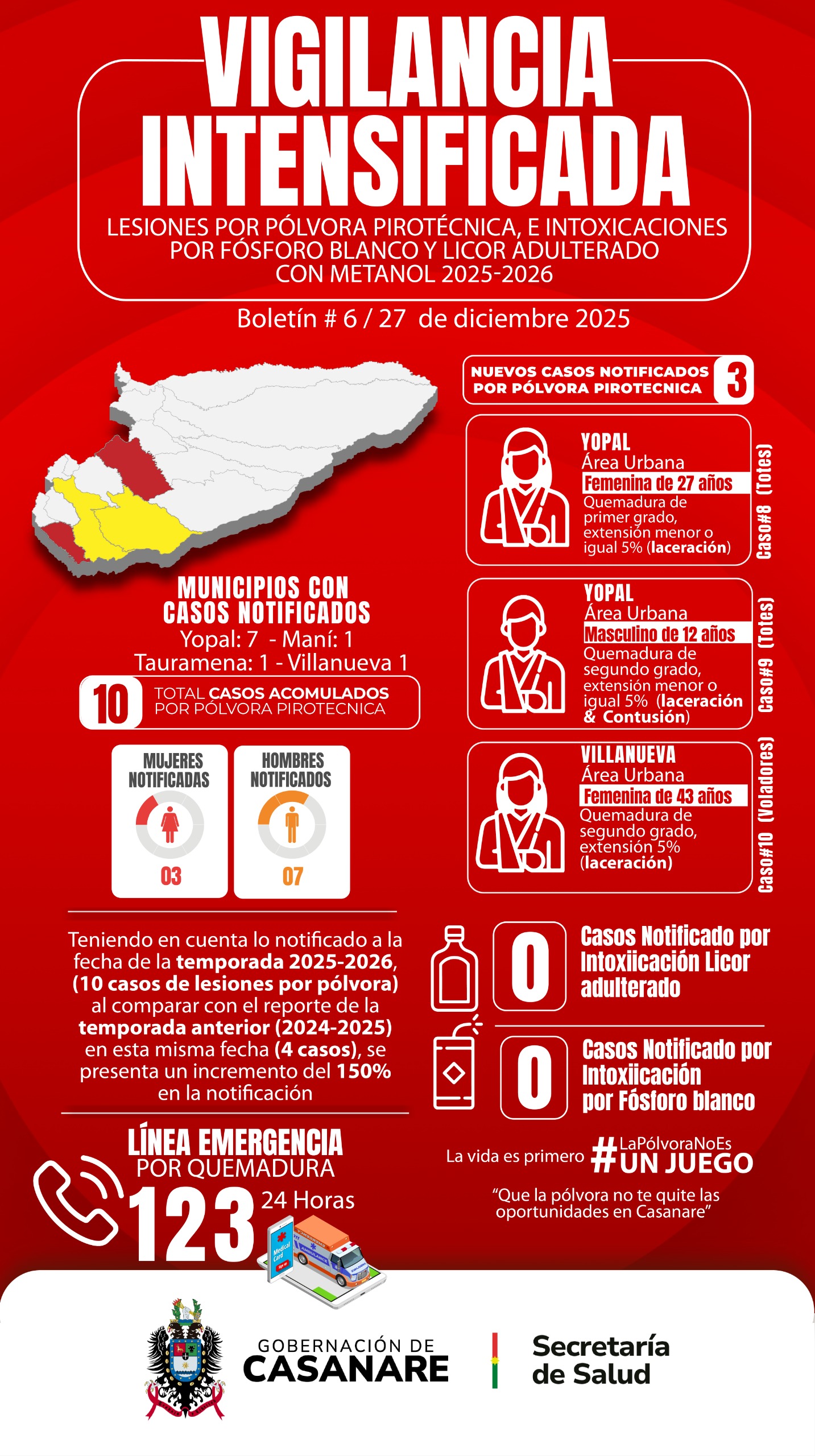 Con corte al 27 de diciembre de 2025 (14:00:00 hrs) se han notificado al departamento un total de 10 casos confirmados por clínica de lesiones por pólvora pirotécnica, de los cuales tres (3) casos ingresaron en las últimas 24 horas (tabla 1).